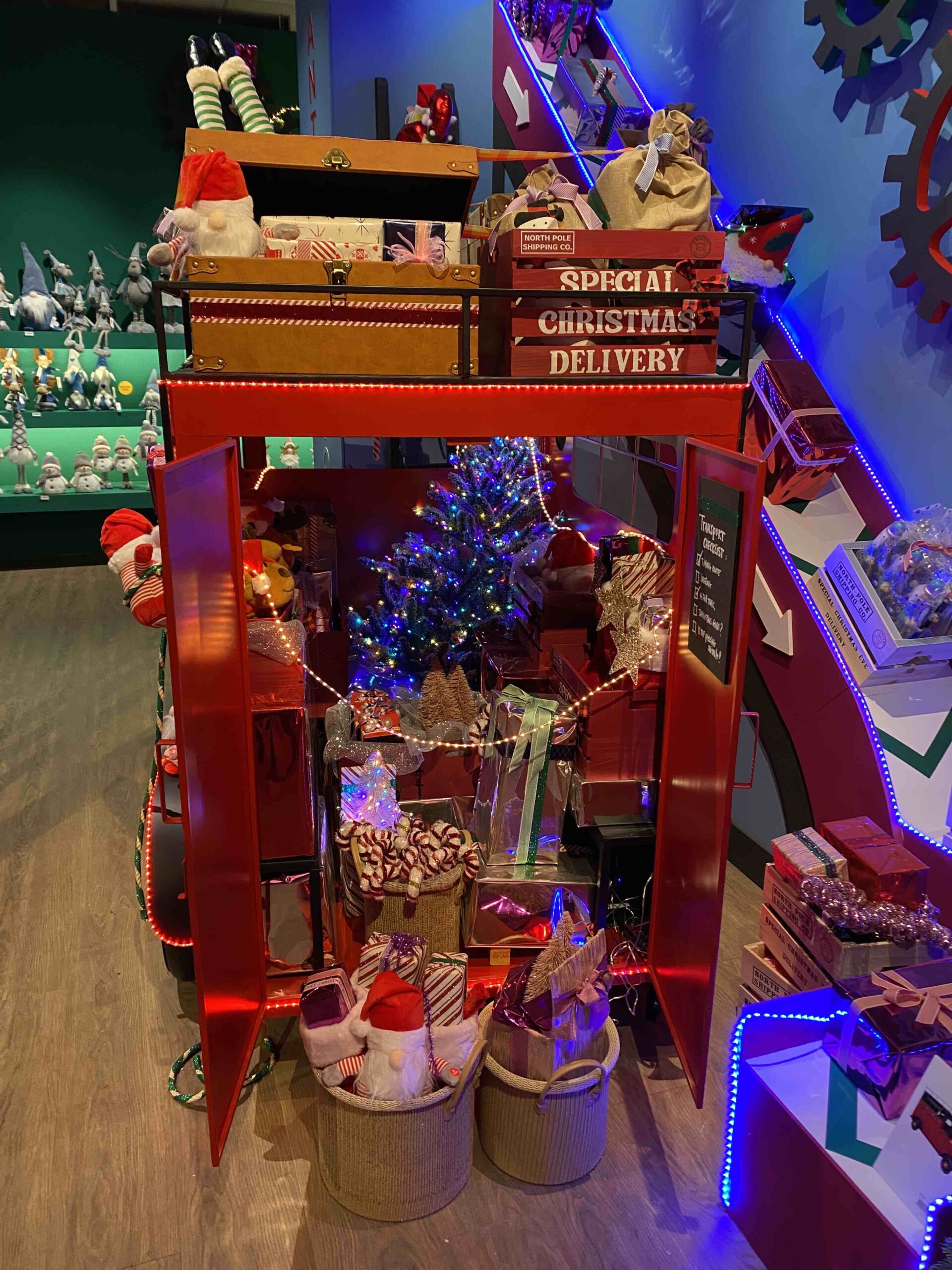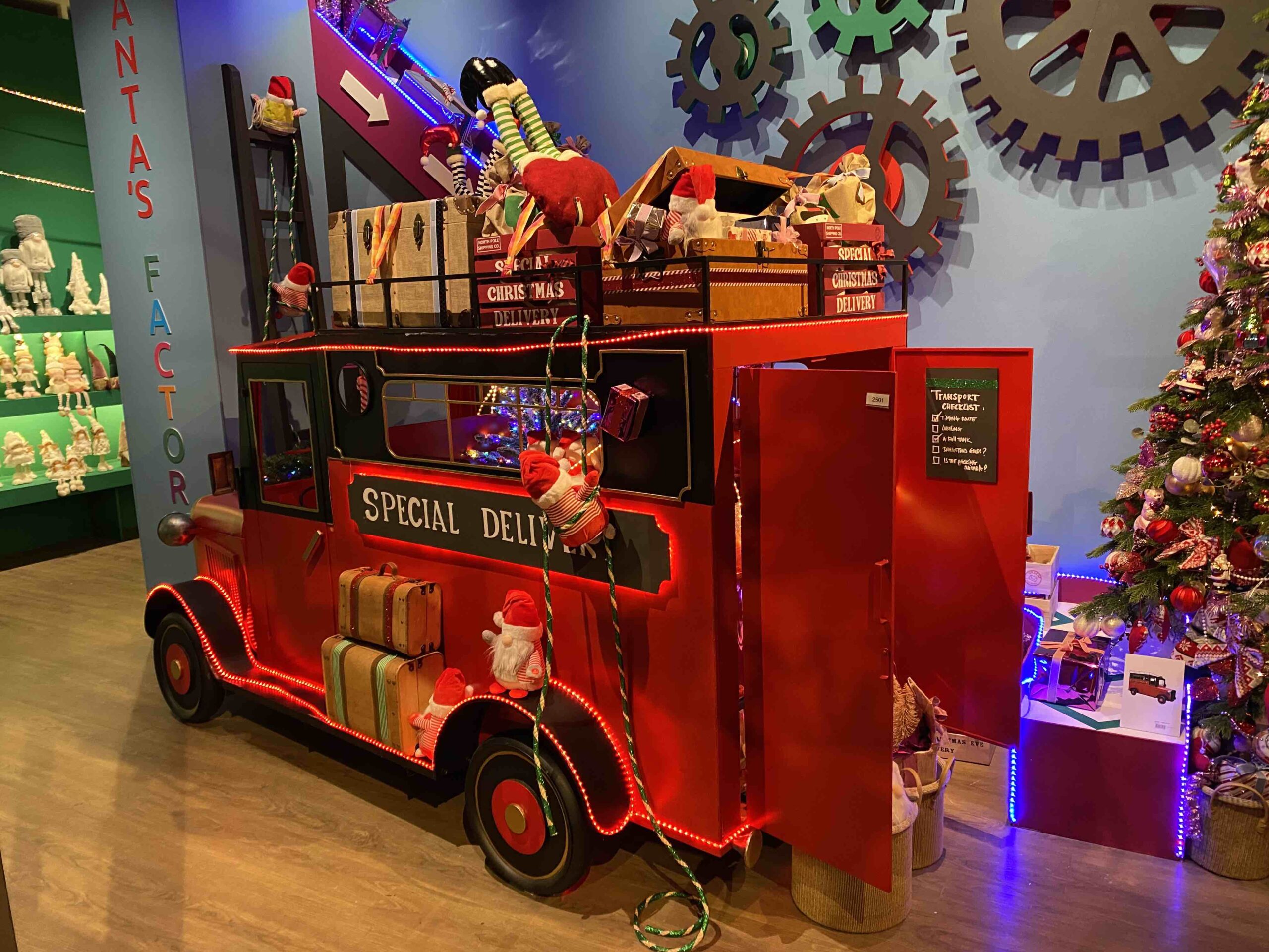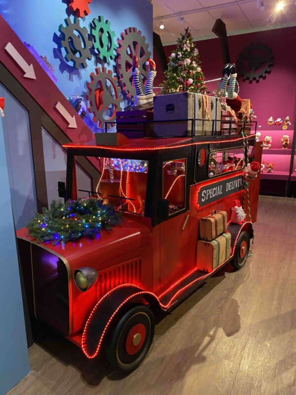 Le toit de la camionnette est également orné de décors festifs, ajoutant une dimension supplémentaire à ce tableau féérique. Des guirlandes lumineuses et des ornements brillants captivent le regard et complètent l’ambiance magique du lieu.
